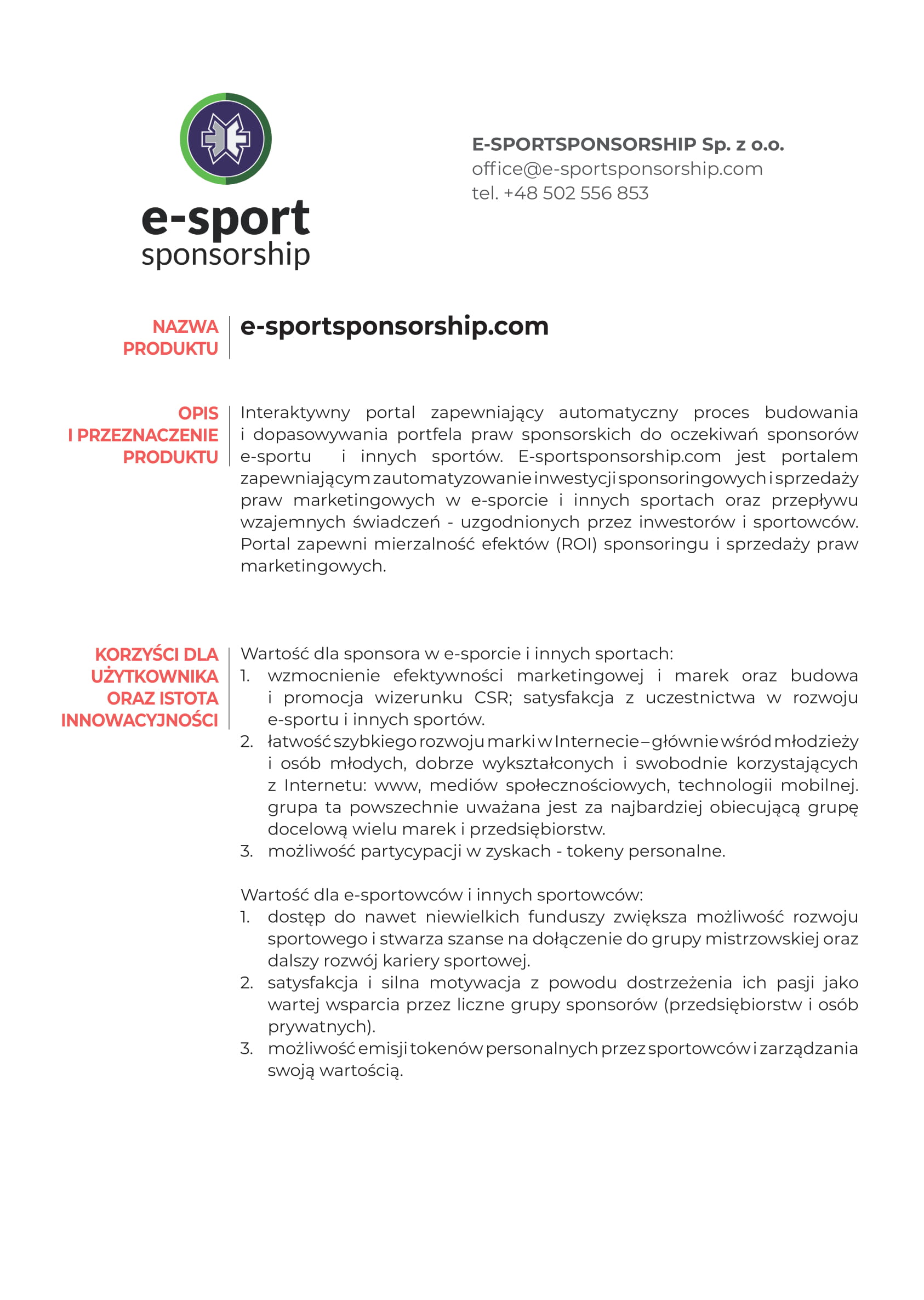 Jednym z nich jest firma E-sport sponsorship Sp. z o. o., która stworzyła interaktywny portal zapewniający automatyczny proces budowania i dopasowywania portfela praw sponsorskich do oczekiwań sponsorów e-sportu i innych sportów.